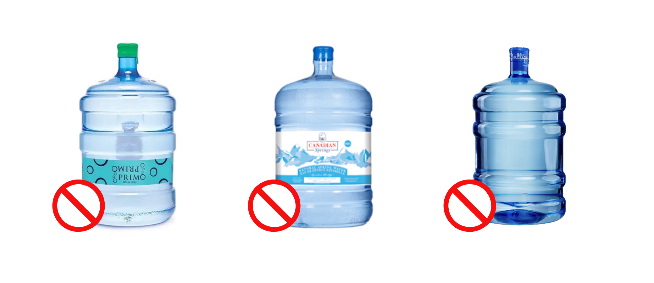 One of the most common questions we get is whether we accept Canadian Springs or Culligan bottles. The answer is no – we only use BPA‑free, industry‑standard 5‑gallon bottles manufactured after 2020. Below, you’ll see examples of bottle designs we don’t accept.