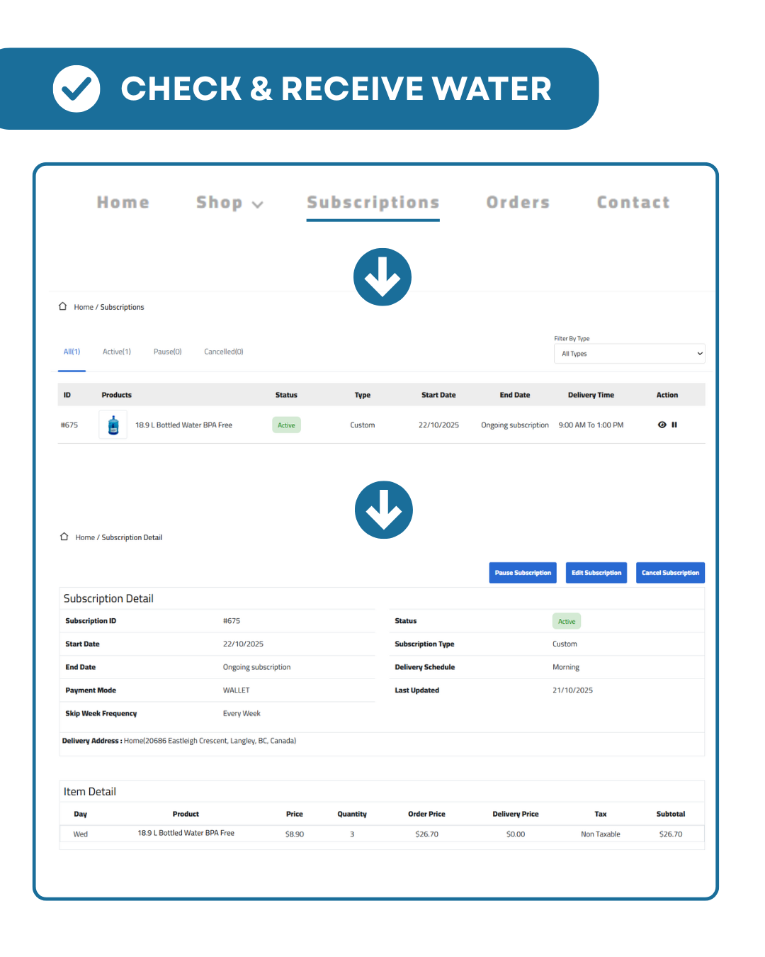Review your subscription and delivery frequency. Lasty, remember to leave empty bottles out on the date of your 1st delivery.